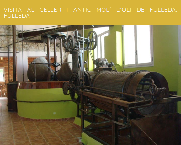 La actividad tiene lugar en Fulleda durante todo el año con reserva previa y combina la visita guiada a su característico museo del aceite y descubrimiento del patrimonio histórico de la población con las visitas a la bodega Matallonga y la destilería Gabarró Feixa